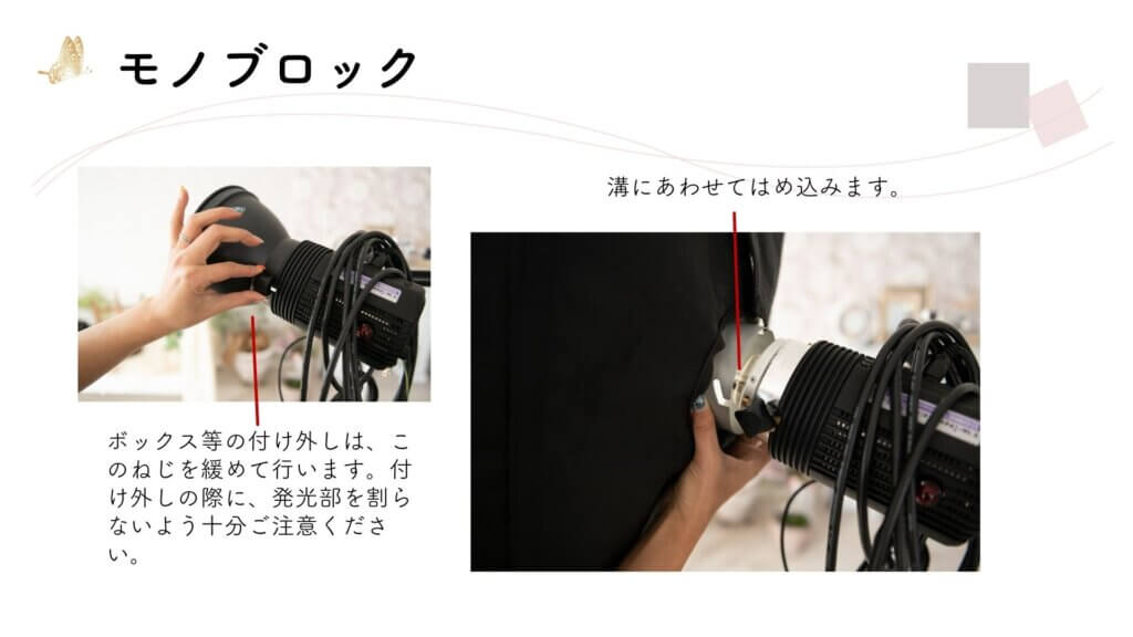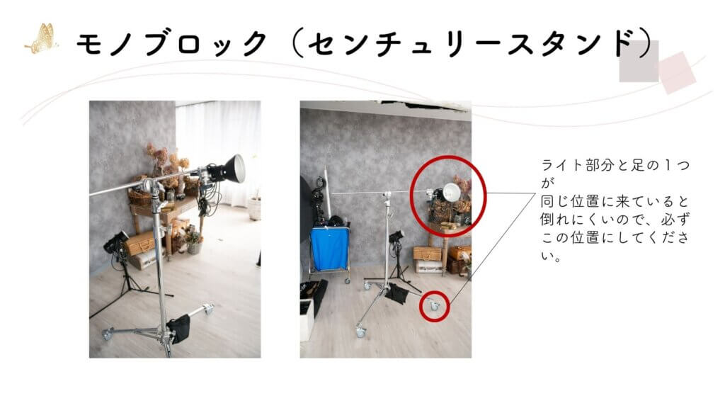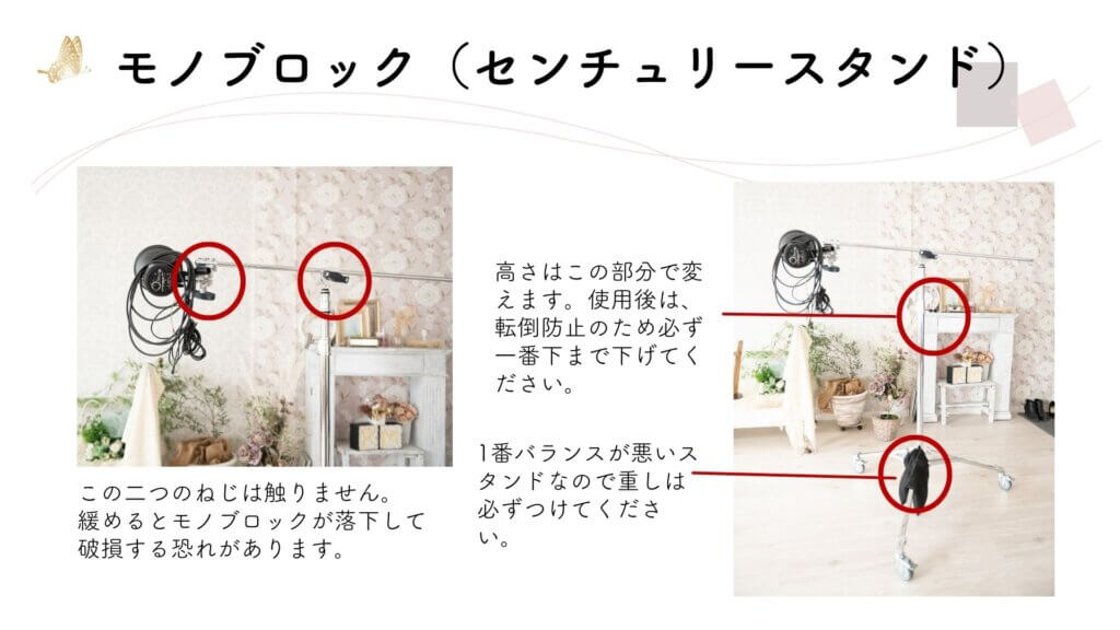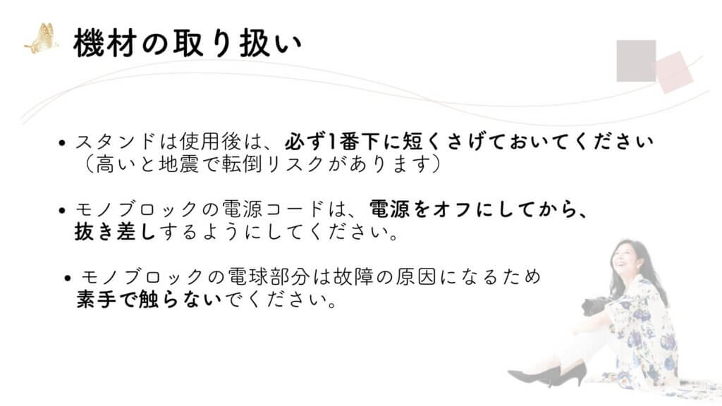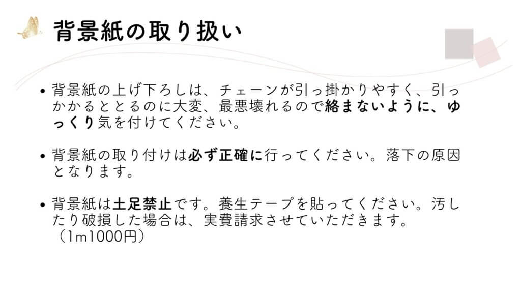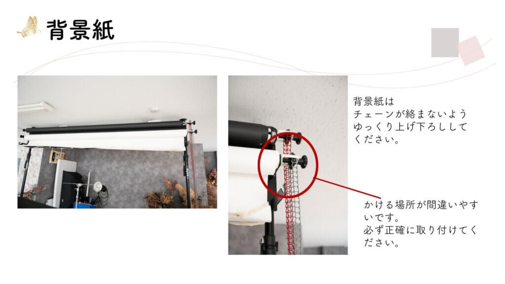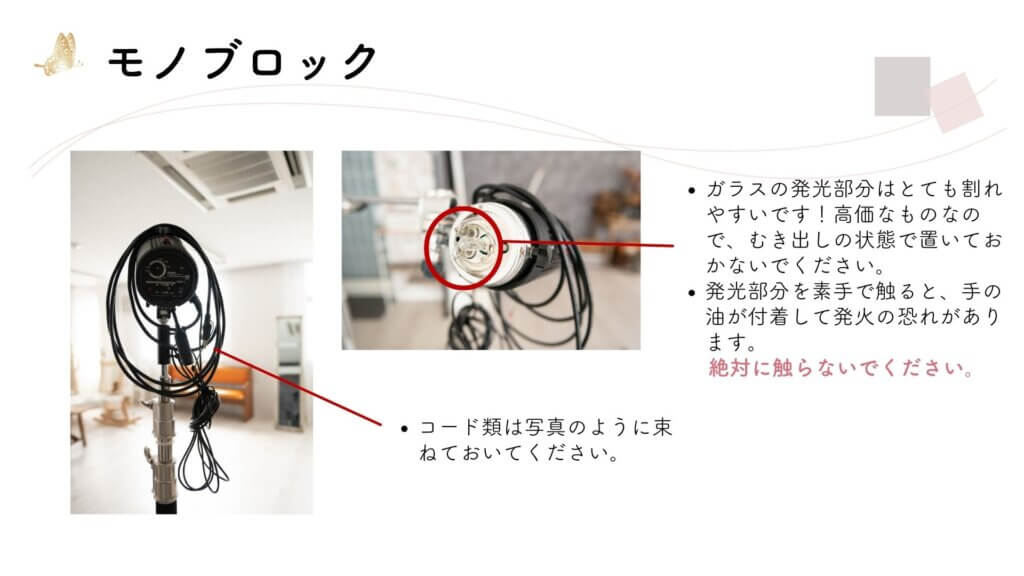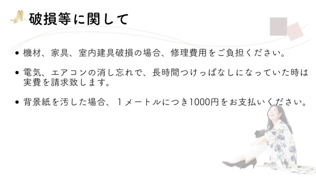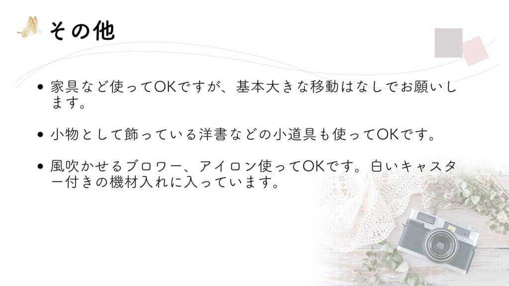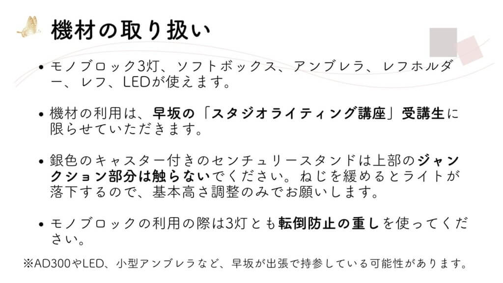 ・使用した機材の報告と、スタジオの使用前、使用後のお写真をお送りください。