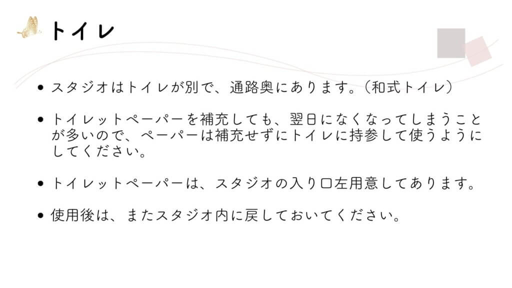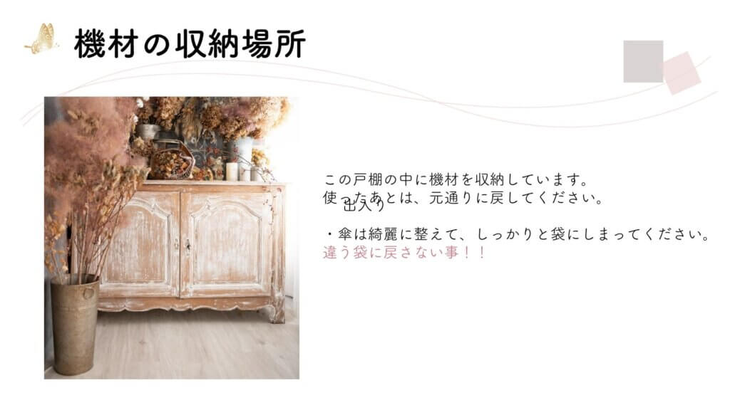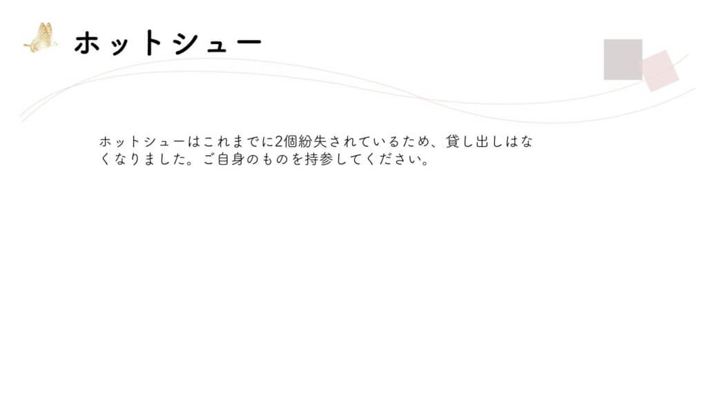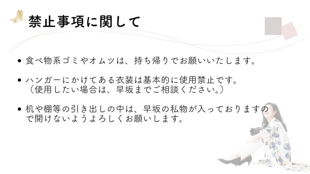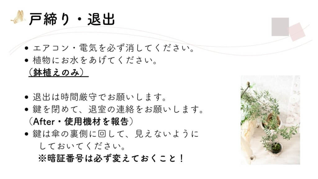 ・備品が壊れている等、何か気づいたことがありましたら、そちらもご連絡よろしくお願いいたします。