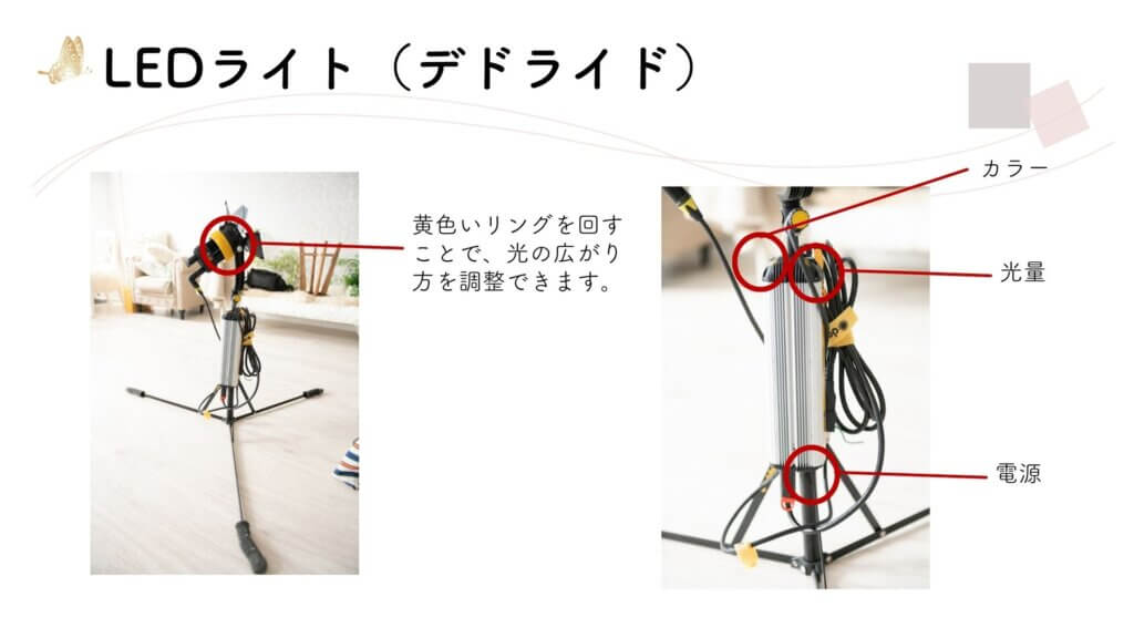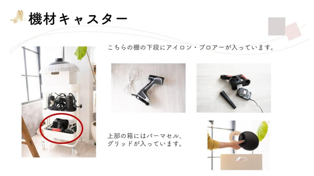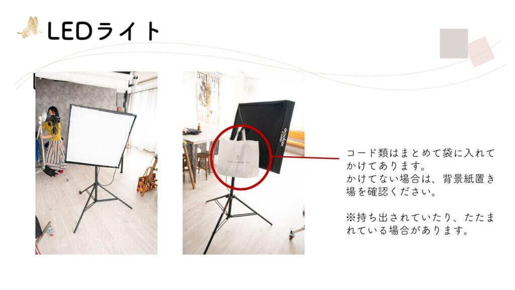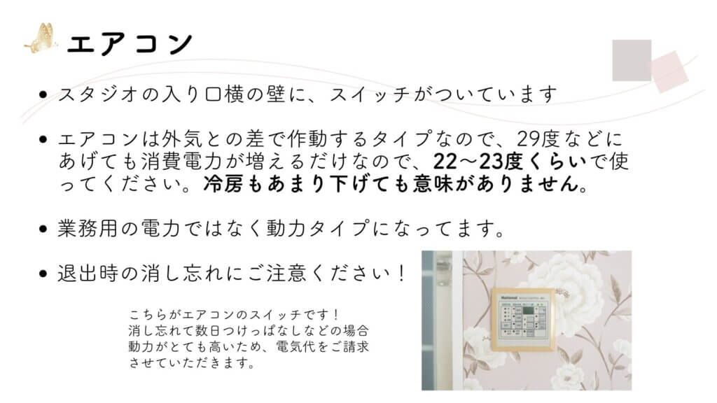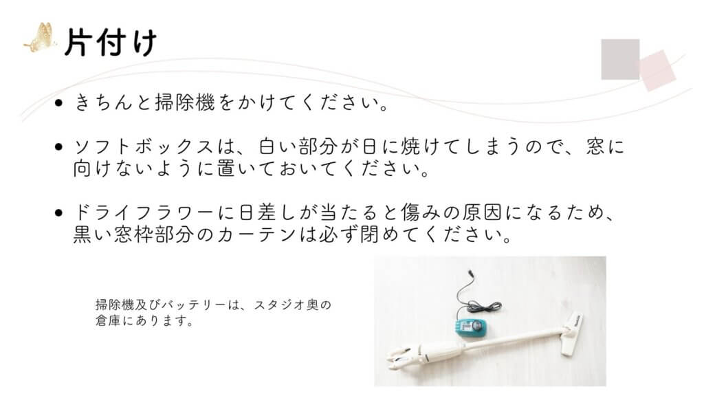 ・スタジオ内の掃除機がけをお願いします。使用後、掃除機の充電も忘れずお願いいたします。
