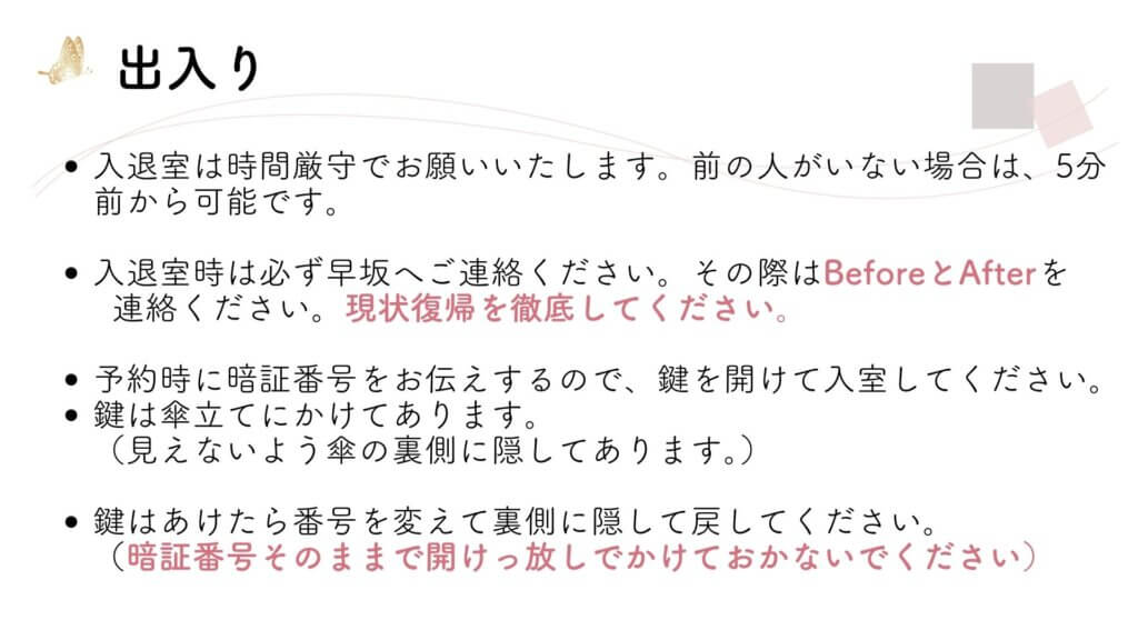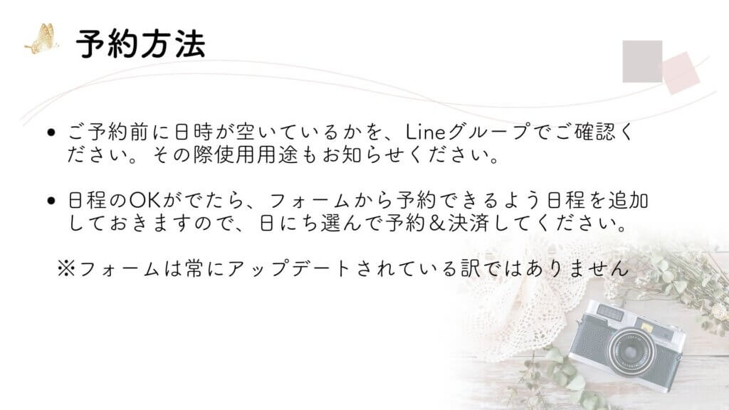 ・サイトから予約する前に、LINEグループで必ず空き状況の確認をお願いします。