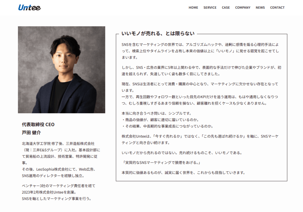 戸田様は、InstagramやTikTokをはじめとするSNS運用や、広告・SEO・ECモールなどのWebマーケティング全般に関する戦略策定〜実行支援を行う株式会社Unteeの代表。